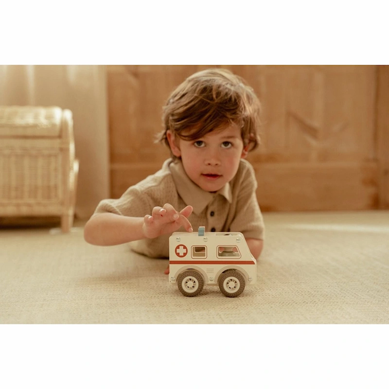 Ambulancia de madera Little Dutch con ruedas de goma y enfermera incluida.