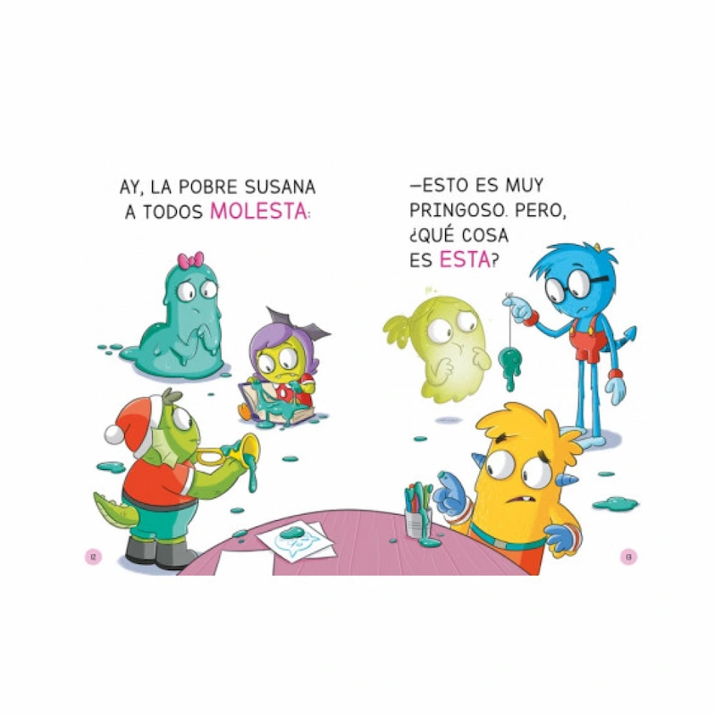 En Aprende a leer en la Escuela de Monstruos 10 – Dame helado o me deshago, conocemos a Susana, una monstruita que con el calor se vuelve pegajosa y pringosa, ¡casi como un helado derritiéndose al sol!