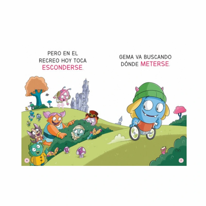 En Aprende a leer en la Escuela de Monstruos 12 – Una idea sobre ruedas, Gema es una monstruita juguetona que adora jugar al escondite. Pero hay un pequeño problema… ¡sus ruedas hacen que siempre la descubran enseguida! ¿Podrá tener una idea brillante que la ayude a esconderse mejor que nadie?