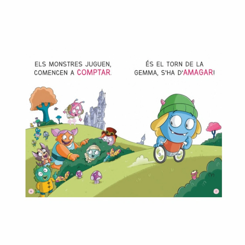 En Aprendre a llegir a l’Escola de Monstres 12 – Una idea sobre rodes, la Gemma vol jugar a amagar-se com els altres, però les seves rodes no li ho posen fàcil.