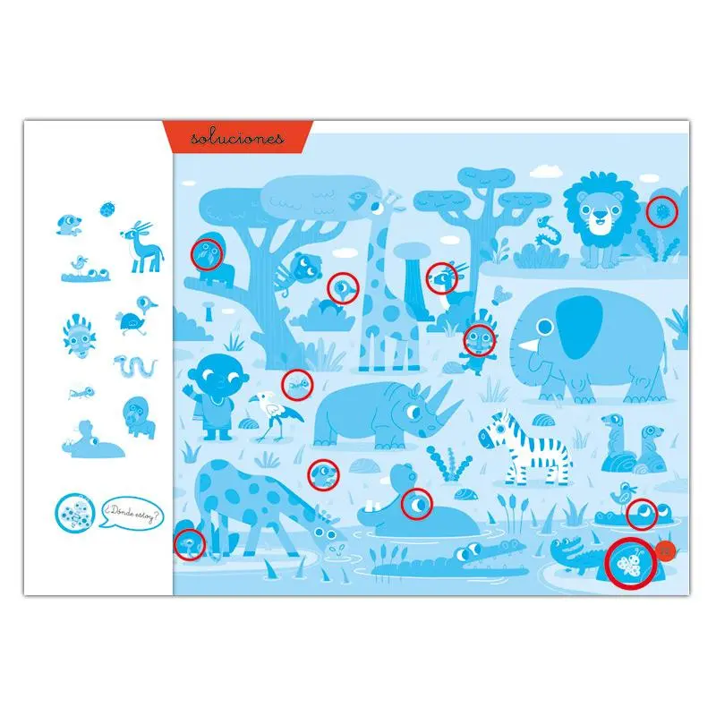 Un libro de buscar y encontrar con animales, páginas plastificadas y rotulador borrable para jugar una y otra vez. Ideal para llevar a cualquier parte.