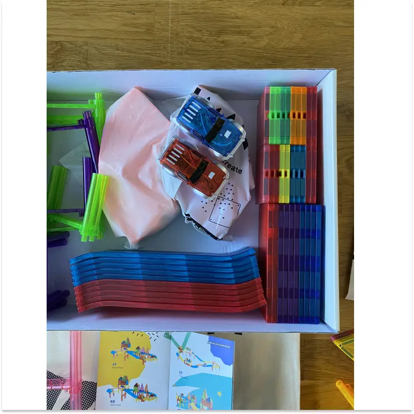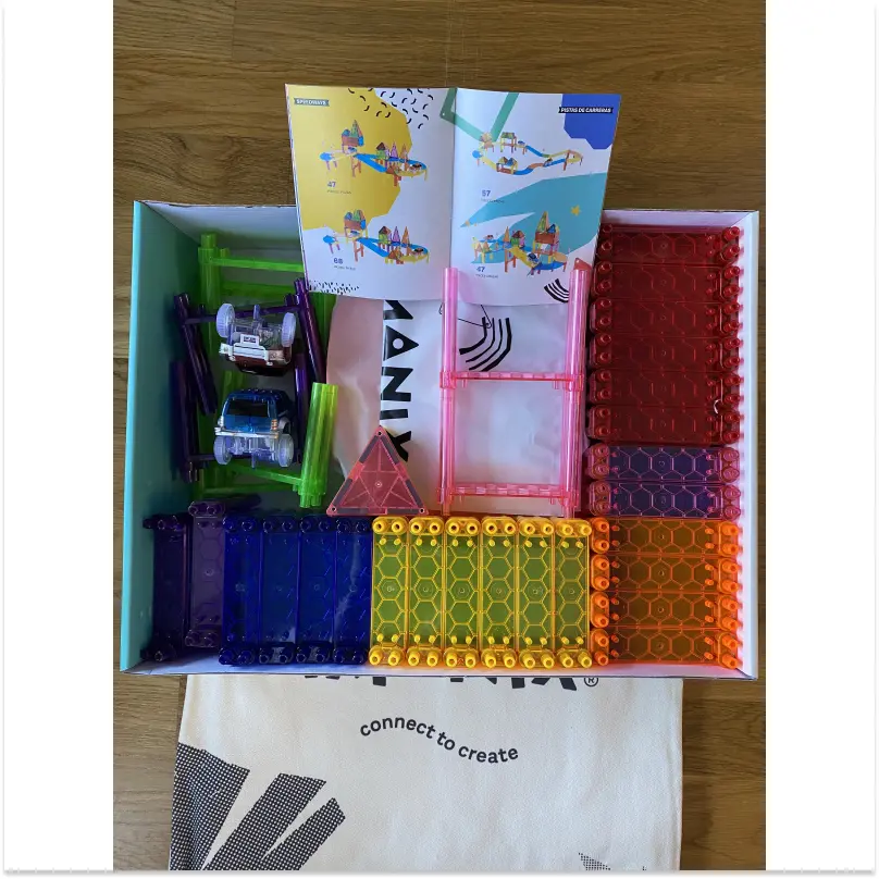 El Imanix Pista de Carreras 105 piezas es un set de construcción magnética que permite a los niños crear circuitos de coches llenos de movimiento, curvas y velocidad.