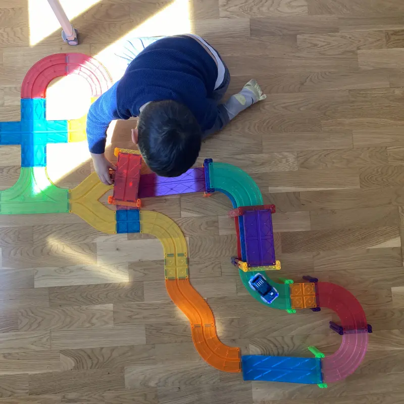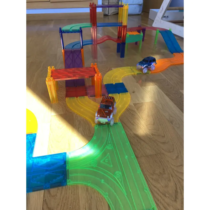 Construcción magnética con circuito de coches para crear recorridos más completos y disfrutar viendo cómo sus pistas cobran vida sin pantallas.