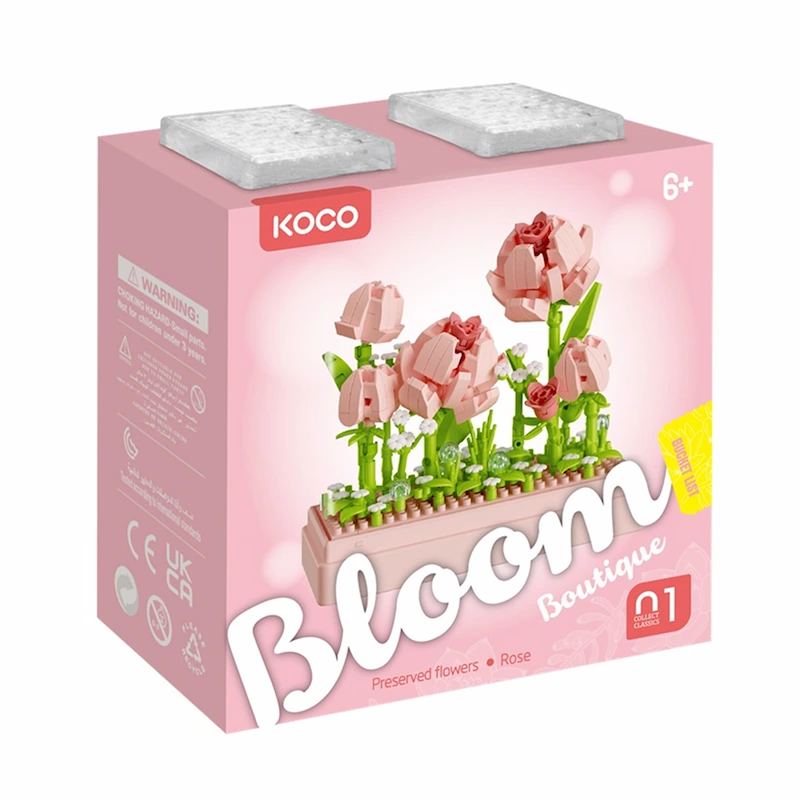 ¡Bienvenido al mundo floral de Koco! Con el set Fresh Flower Rosa 349 piezas, tu pequeño constructor podrá crear un hermoso jardín de rosas paso a paso.