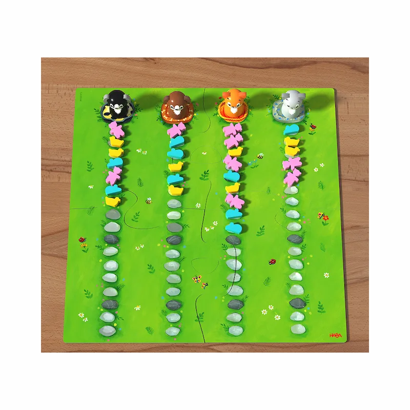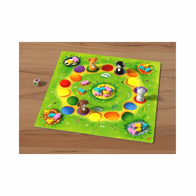 ¡Gatos y perros en acción! En Cuadrilla de Mascotas de HABA, los jugadores tiran el dado de colores y mueven a su animal por el tablero. Por cada mascota rival que salten, se llevan un juguete. Al final, gana quien logre reunir la mayor colección.