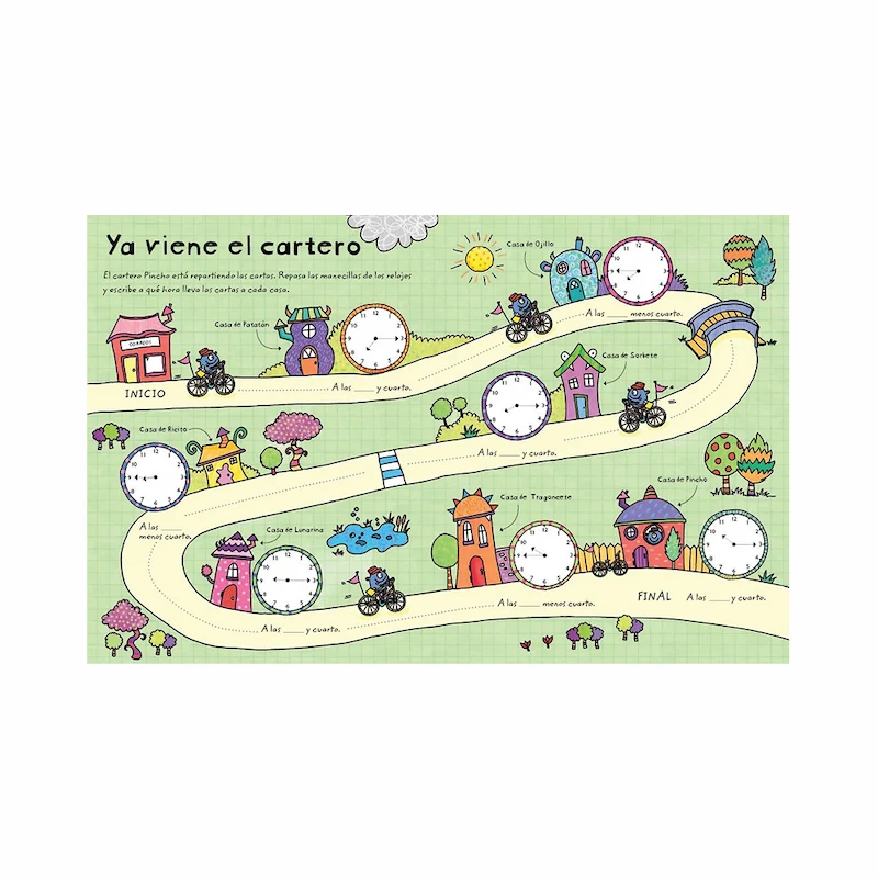 Incluye actividades paso a paso para aprender horas en punto, medias horas y minutos, fomentando la concentración, la motricidad fina y la autonomía.