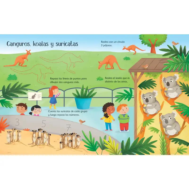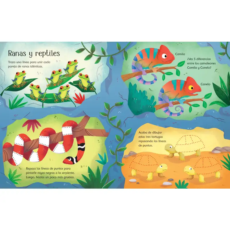 Incluye actividades como buscar las diferencias, unir los puntos, resolver laberintos y concursos de preguntas, entre otras, que permiten trabajar la observación, la lógica y la atención.