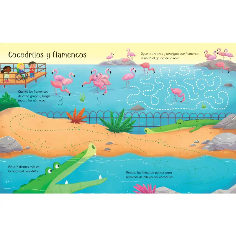 Libro pizarra con actividades inspiradas en el zoo, como buscar diferencias, unir puntos, laberintos y juegos de preguntas. Rotulador incluido.