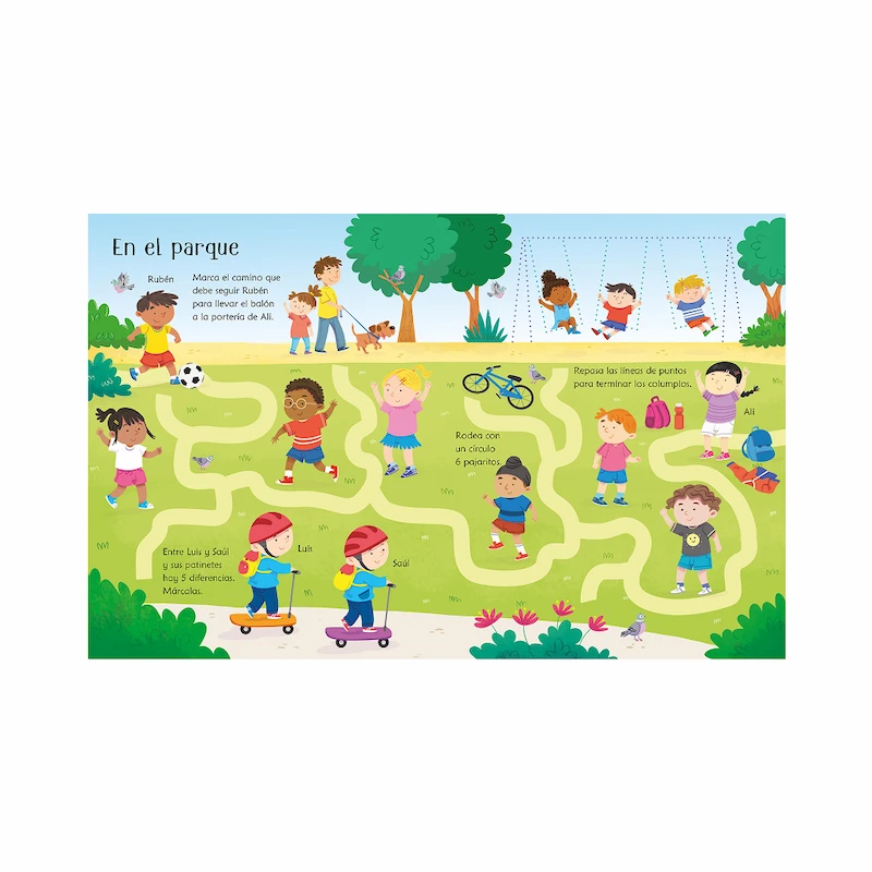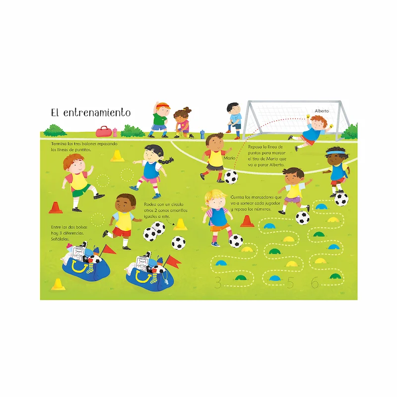 Contiene una gran variedad de pasatiempos inspirados en el mundo del fútbol: laberintos, unir los puntos, buscar las diferencias, contar objetos y dibujos sencillos para colorear.