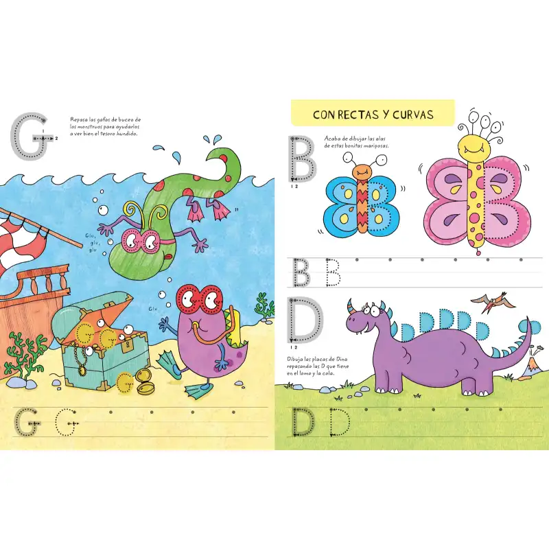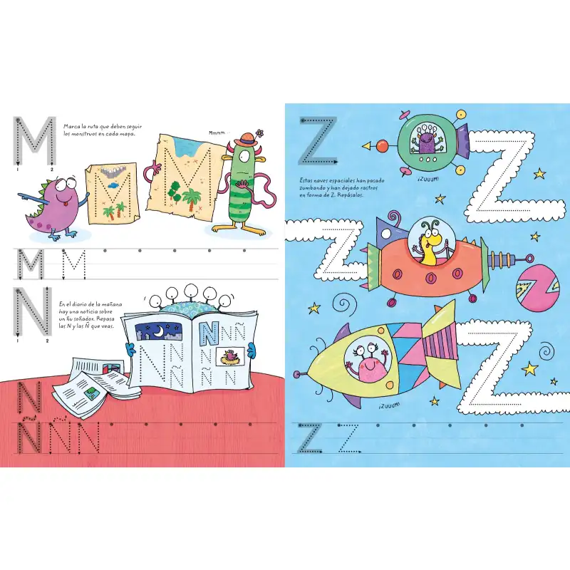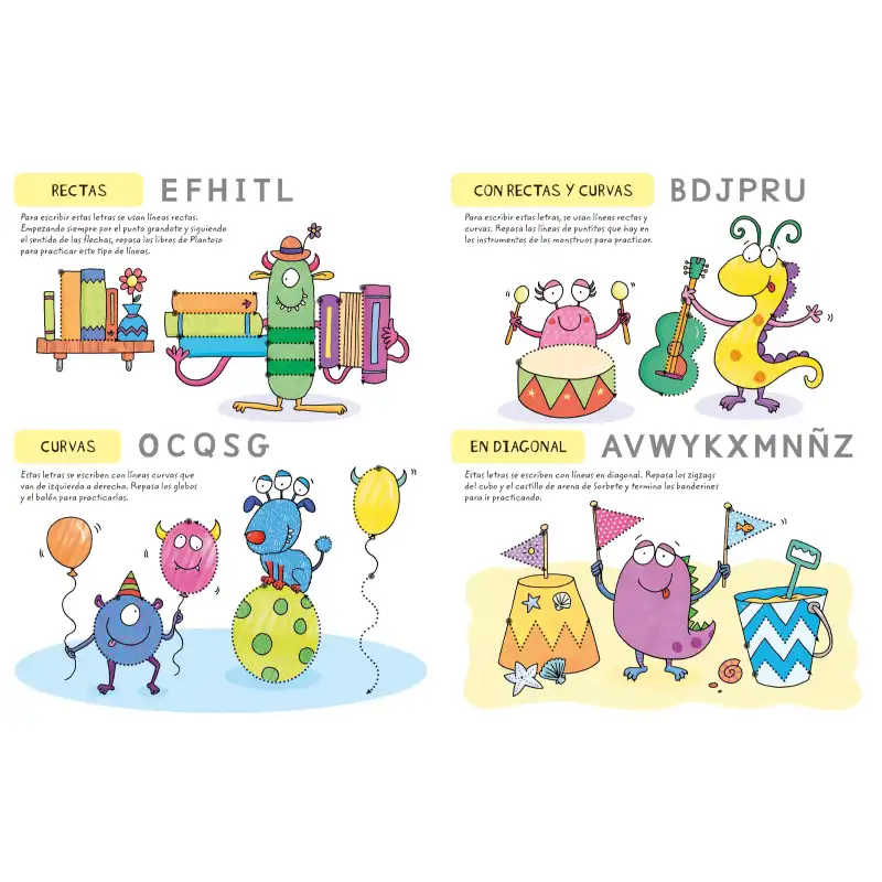 A través de simpáticos personajes y actividades de trazo, los niños practican el control del lápiz y la forma de las letras mediante ejercicios como seguir líneas, trazar formas o completar dibujos.