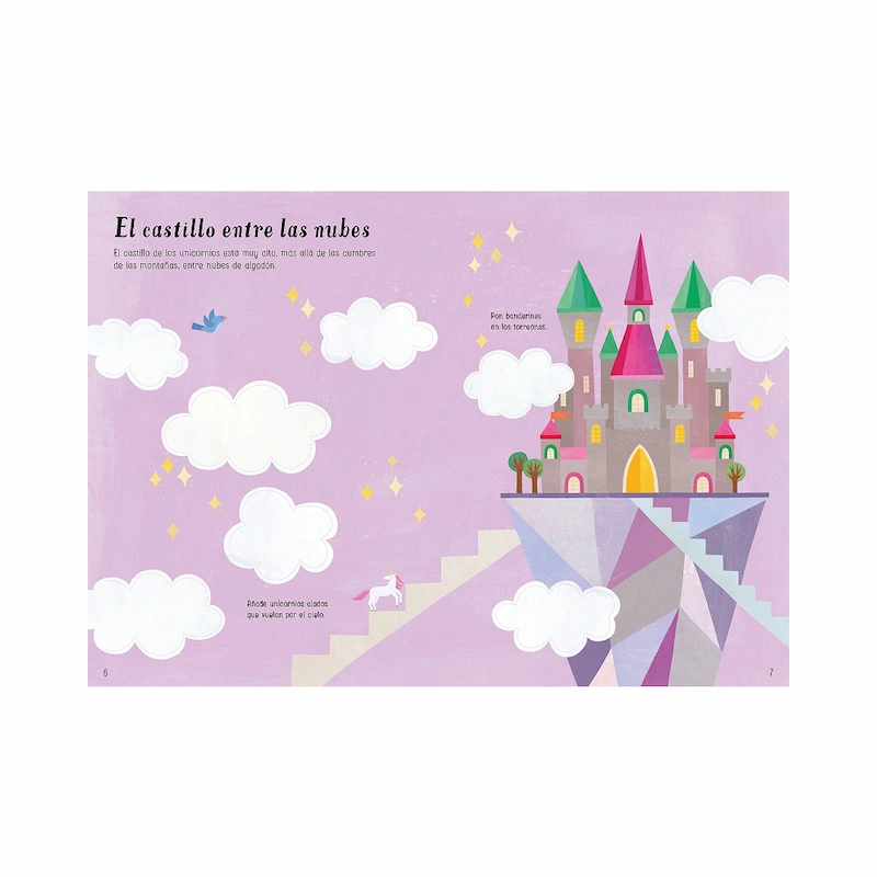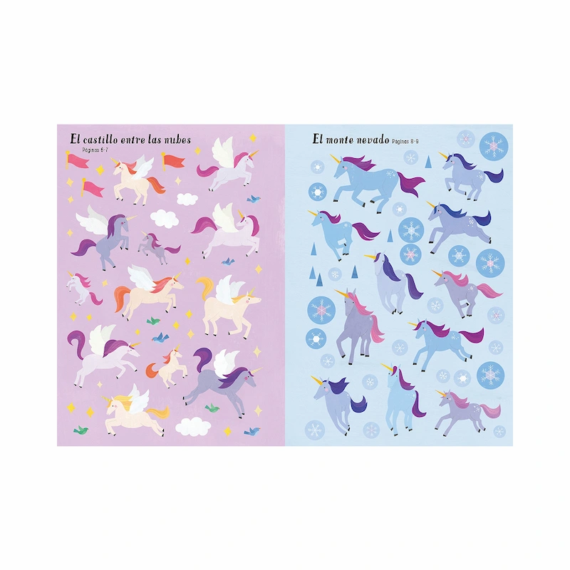 Más de 300 pegatinas reutilizables para crear escenas mágicas de unicornios entre arcoíris, cascadas y bosques encantados.