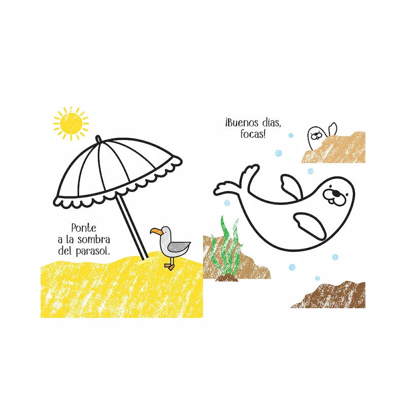 Con ilustraciones de conchas, castillos de arena, peces, cangrejos y escenas marinas, los más pequeños explorarán el verano a través de los colores.