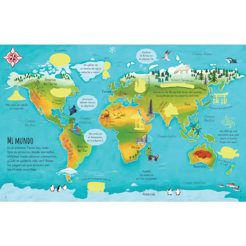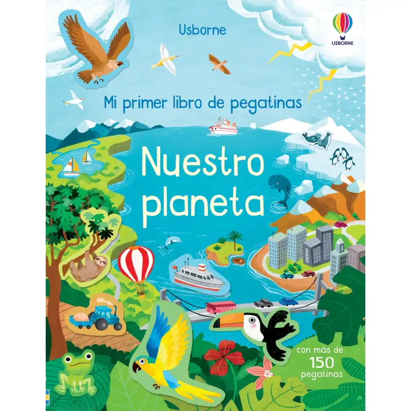 Libro con más de 150 pegatinas con escenas de nuestro planeta que los niños pueden completar siguiendo textos sencillos que les ayudan a colocar cada pegatina.