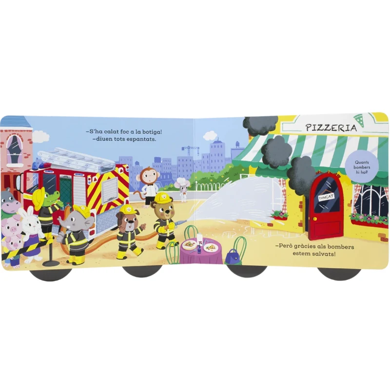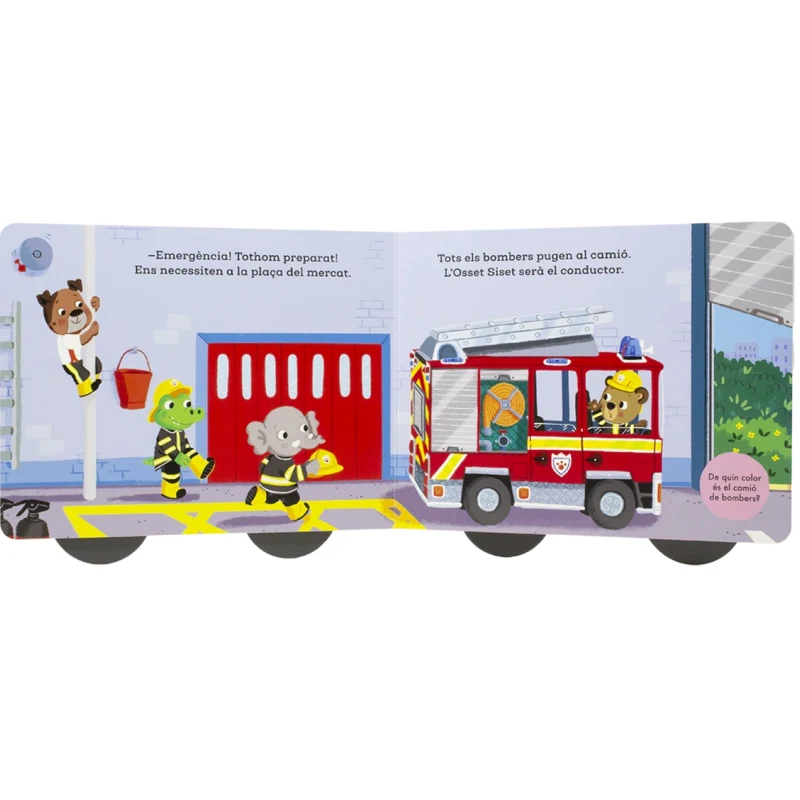 Les rimes mantenen el ritme de la lectura i les preguntes animen a observar i explicar (“On és el foc?”, “Qui ajuda avui?”), reforçant vocabulari, atenció i comprensió.
