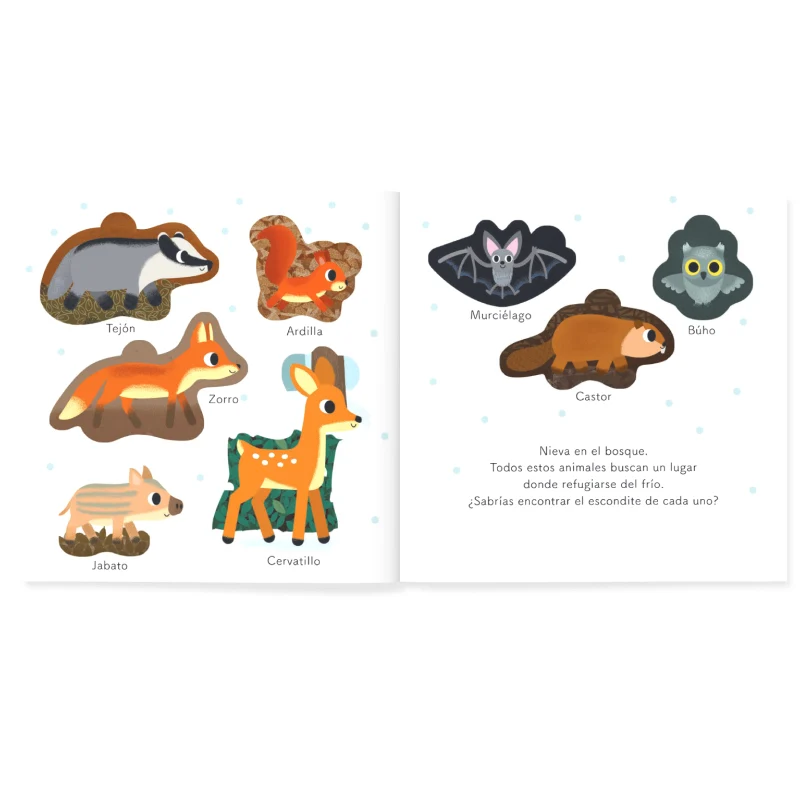 Un libro interactivo con piezas tipo puzle para que los más pequeños descubran dónde se esconden los animales del bosque en invierno.